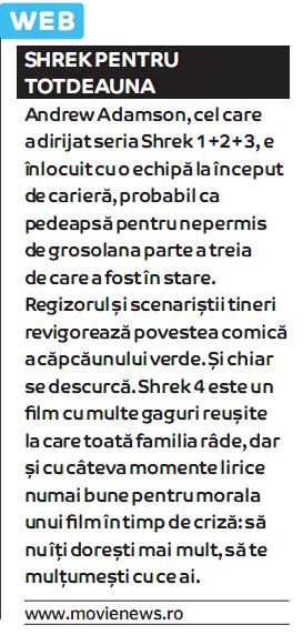 In revista Zile & Nopti cu numarul 39, editia de Bucuresti (13-19 august) a aparut un articol dintr-o recenzie a desenului animat Shrek Forever After semnata de Cristina Zaharia la categoria “Reviews”.