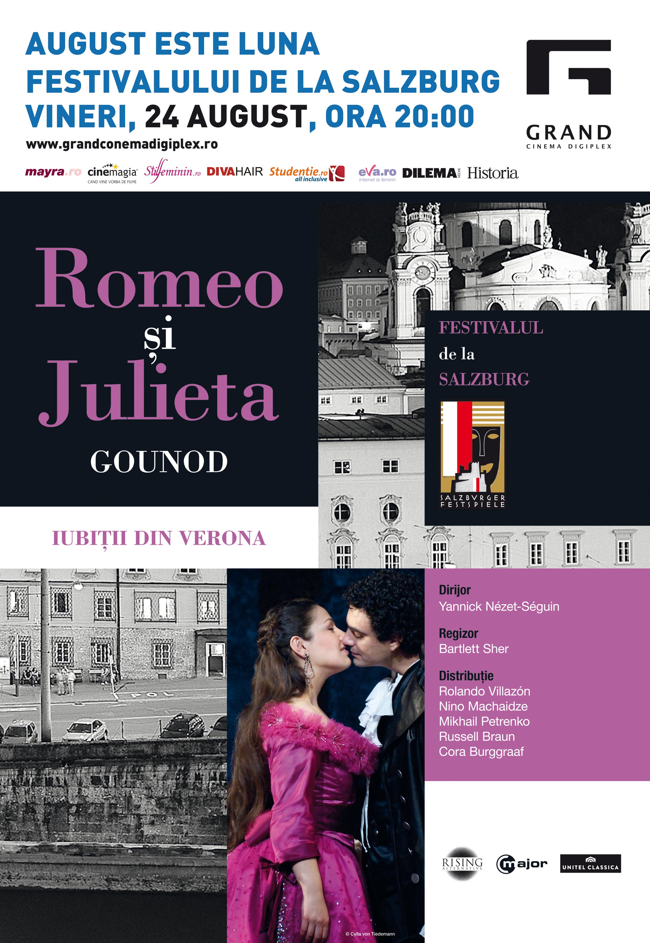 Spectacolul Romeo şi Julieta, în regia lui Bartlett Sher, va fi transmis la Grand Cinema Digiplex, vineri, 24 august, ora 20:00. Creaţie a compozitorului Charles Gounod, opera Romeo şi Julieta rămâne una dintre cele mai impresionante poveşti de dragoste, în ciuda finalului tragic. Regizorul Bartlett Sher, câştigător al unui premiu Tony pentru musicalul South Pacific, îşi face debutul european cu producţia Romeo şi Julieta. Binecunoscutul tenor Rolando Villazón interpretează rolul lui Romeo alături de tânara şi frumoasa Nino Machaizde, una dintre cele mai apreciate soprane din lume.