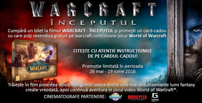 În perioada 26 mai – 19 iunie 2016, pentru fiecare bilet pentru filmul Warcraft. Începutul cumpărat la cinematografele participante – Grand Cinema & More Băneasa, Hollywood Multiplex Bucureşti Mall şi MOVIEPLEX CINEMA – veți primi un card-cadou cu care veți putea activa jocul World of Warcraft pe contul de Battle.net, primind astfel acces la jocul de bază plus expansion pack-uri.