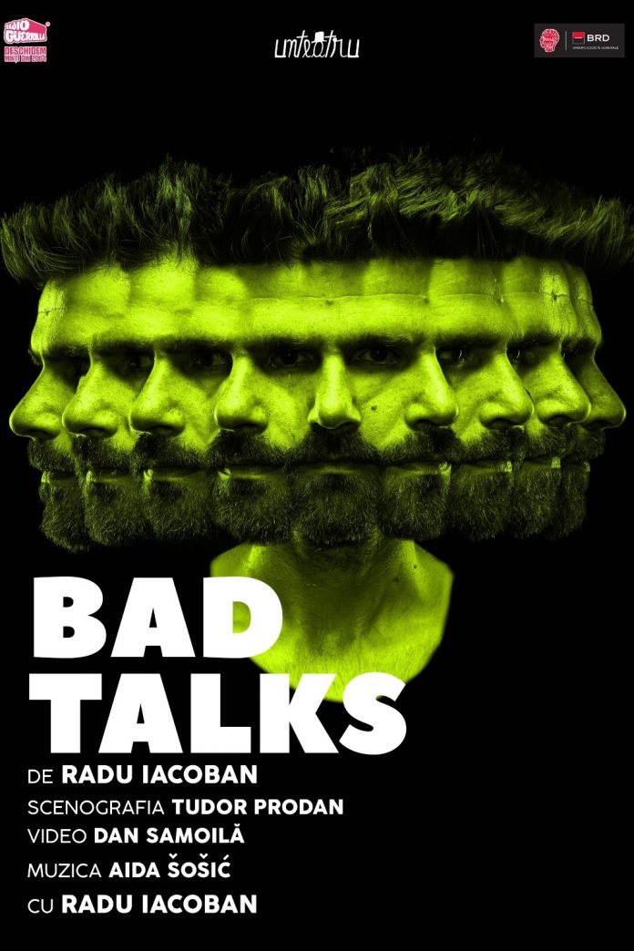 Într-o lume mai mult sau mai puțin imaginară, un eveniment șocant dă naștere unei reacții în lanț. De aici și până la instaurarea unei noi dictaturi, nu mai e decât un pas. Bad Talks, de Radu Iacoban, este un spectacol dus cu pluta, populat de personaje pe care sigur le știi, dar cu care nu ai stat de vorbă niciodată. Un actor, o multitudine de perspective asupra unei situații ipotetice, care ar putea schimba cursul istoriei – în premieră la Unteatru, pe 9 august, de la ora 19:00, și pe 24 august, de la aceeași oră.