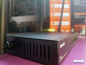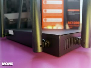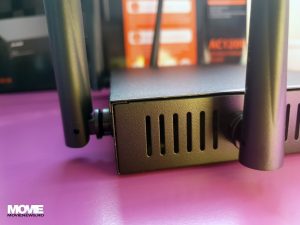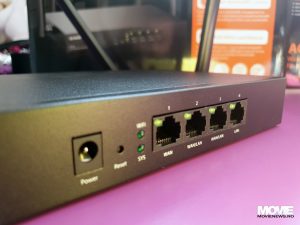 După cum spuneam, cele 4 port-uri de conectare sunt 1xWAN, 1xLAN și 2xWAN/LAN cu LED-uri de activitate pentru fiecare; avem un buton de Reset și LED-urile pentru Wi-Fi și SYS care dacă sunt închise înseamnă că ceva nu funcționează, iar dacă sunt aprinse înseamnă că există conexiune de 2.4Ghz sau 5Ghz (Wi-Fi) respectiv că sistemul funcționează. Dacă LED-urile clipesc (inclusiv cele de deasupra port-urilor active) înseamnă că există activitate și totul funcționează normal.