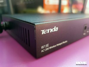 W15E are o carcasă metalică, rezistentă, partea de jos având patru piciorușe de susținere și găuri pentru montarea pe perete, iar pe mijloc avem un sticker cu codul de bare, SSID-ul, MAC-ul, modelul și un link și IP de unde se poate conecta pe el. Partea de deasupra este simplă, cele laterale fiind cu aerisiri și câte o antenă pivotantă, fiecare. Latura din spate este simplu plus alte două antene pivotante, iar în partea din față avem panouri de conexiuni unde sunt prezente: port-ul pentru alimentare de la curent, buton de Reset, două LED-uri pentru Wi-Fi și SYS și 4 port-uri dintre care 1xWAN, 1xLAN și 2xWAN/LAN. Tot acolo avem imprimat și logo-ul Tenda și modelul.
