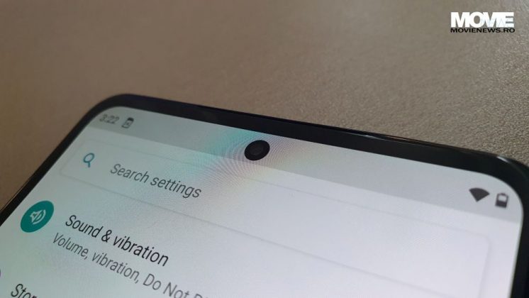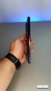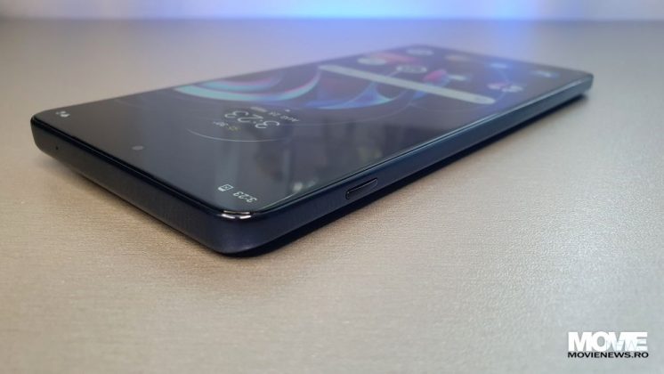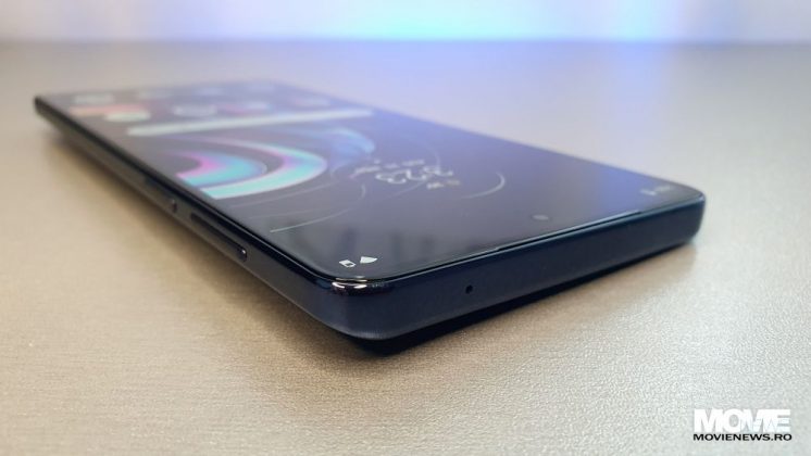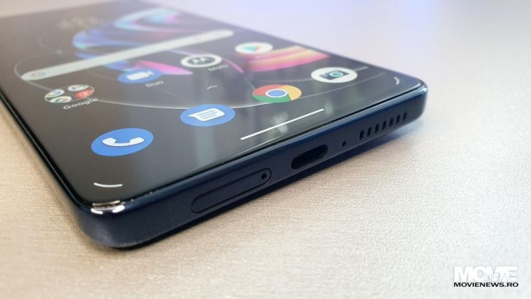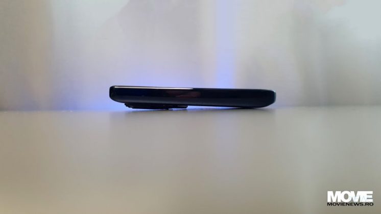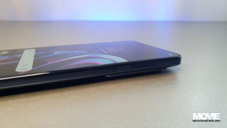 Pe latura mică de sus avem un microfon, iar pe cea de jos avem sertarul pentru Dual SIM, un alt microfon, portul USB-C și un difuzor. Pe latura din stânga avem un buton pus în modul default ca acces rapid la comenzile vocale via Google Assistant, iar pe cea din dreapta avem butonul de Power care încorporează și senzorul de amprente și butonul de volum (+/-).