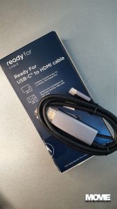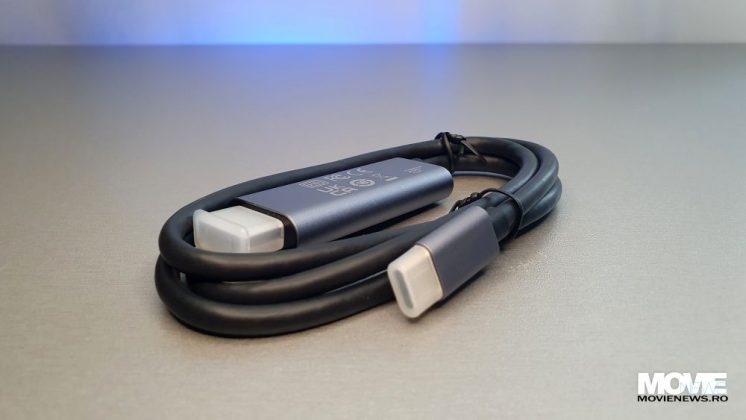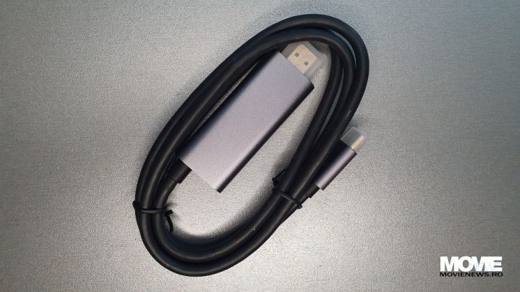 Odată deschisă cutia am rămas surprins că includea două cutii – una cu un cablu de conectare rapidă la orice TV sau display și compatibil USB-C – HDMI și una cu smartphone-ul.