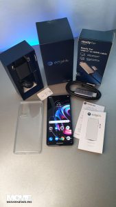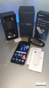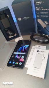 În cutia “Ready For” am găsit acel cablu special într-un capăt cu USB-C și în altul cu HDMI, iar în cel cu smartphone-ul găsim device-ul cu o folie aplicată care se dă jos, pus într-o husă de silicon transparentă; o cutie cu un ghid rapid de instalare și unul cu termene și condiții; cheița pentru SIM, cablul de alimentare/date USB – USB-C și alimentatorul pentru curent TurboPower. Cutia smartphone-ului este confecționată dintr-un carton tare, cea “Ready For” dintr-un carton mai maleabil parcă mult mai mare decât e cablul în sine.