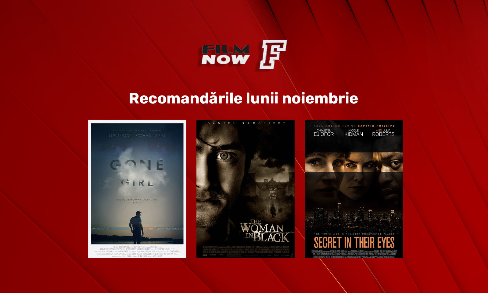 În luna noiembrie, a treia săptămână este dedicată pasionaților de producții thriller. Luni, 15 noiembrie, de la ora 22:25, telespectatorii pot urmări Gone Girl/ Fata dispărută. Producția surprinde o frenezie mediatică produsă de dispariția soției personajului Nick Dunne în ziua aniversării a cinci ani de căsătorie. În lumina reflectoarelor, imaginea de soț iubitor începe să se spulbere, așadar, sub presiunea poliției, nevinovăția acestuia se transformă treptat în reale semne de întrebare. Să fie el cel care și-a ucis soția? Să fi construit un profil fals al iubirii dintre ei? Nu rămâne decât să descoperiți dacă minciunile, înșelăciunile și comportamentul ciudat vor confirma vinovăția lui Nick sau dacă toate acestea indică șocul trăit de soț într-un moment în care celebrarea unei căsnicii este înlocuită cu moartea. Totul se întâmplă doar la Film Now!
