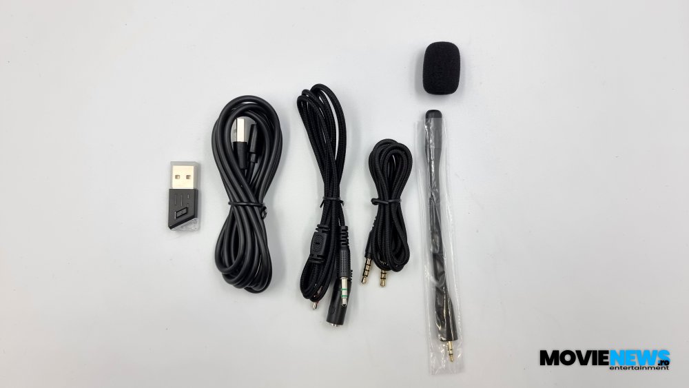 Deschidem cutia, cu un interior albastru pe capac și o folie de plastic tare și transparentă, sub care se vede cartonașul specific cu câteva cuvinte adresate utilizatorului de către producător și un How to, pe cealaltă parte a cartonașului (un grafic cu posibilitățile de conectare). Într-un cofraj negru din plastic tare avem o husă cu fermoar, dintr-un material aproape catifelat și plăcut la atingere, iar înăuntru sunt căștile, pliate, într-o punguță de protecție. Pe lângă Ghidul de instalare rapidă + Stickere, avem și câteva accesorii care constau într-un microfon detașabil și maleabil cu un pop-up filter, detașabil și el, receiver-ul USB cu LED de stare și o urechiușă pentru atașat la cheie sau de pus șnur, cablu de încărcare USB – micro-USB, cablu cu jack-uri în ambele capete și un cablu cu două mufe jack (audio și microfon) într-un capăt și în celălalt un port pentru ieșire jack.