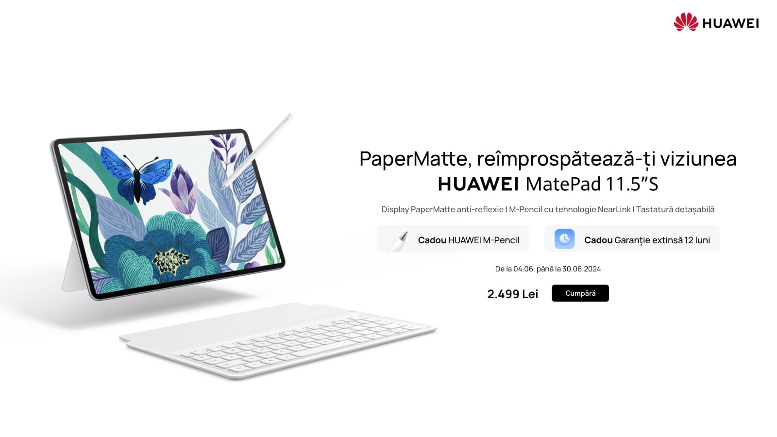 În perioada 4-30 iunie, cei care își vor achiziționa HUAWEI MatePad 11.5″S de pe HUAWEI Store România, vor primi cadou și un stylus HUAWEI M-Pencil (3rd generation), dar și garanție extinsă 12 luni. De asemenea, în pagina produsului va fi afișat și un cupon extra de 500 de lei, care poate fi folosit pentru achiziționarea unei perechi de căști HUAWEI FreeBuds 5 în aceeași comandă sau pentru a beneficia de o reducere directă de 500 de lei din prețul tabletei.