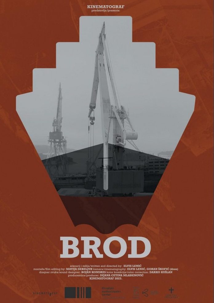 În Brod – un documentar montat de Matija Debeljuh, aflăm o poveste reală și tristă de după mai bine de 160 de ani de existență a șantierului naval din Pula ‘Uljanik’ cândva un port extraordinar care construia nave mamut, acum devenit un cimitir de ateliere abandonate, epave de oțel și macarale imobile.