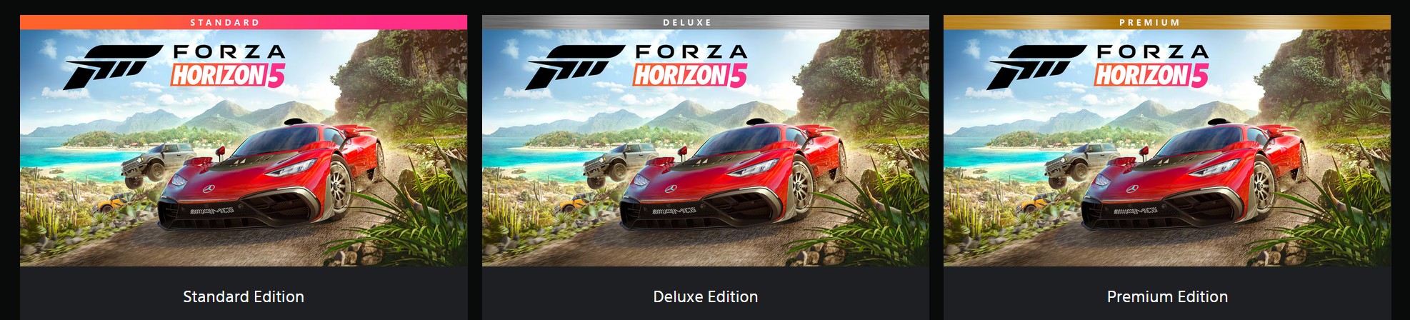 Dacă ediția Standard aduce doar jocul de bază, varianta Deluxe include Forza Horizon 5 Car Pass (include acces la pack-urile cu 42 mașini), iar varianta Premium include, pe lângă conținutul adițional din Deluxe și joc și Forza Horizon 5: Hot Wheels, Forza Horizon 5 Rally Adventure, Forza Horizon 5 Welcome Pack, Forza Horizon 5 VIP Membership, și, după cum vă spuneam, acces mai devreme la joc, din 25 aprilie.