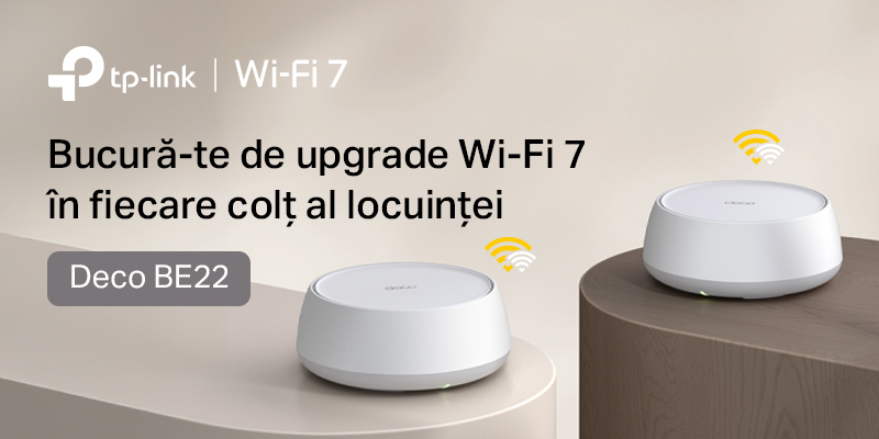 Pe lângă Deco BE22, TP-Link pune la dispoziție o gamă variată de dispozitive compatibile cu Wi-Fi 7, adaptate diferitelor stiluri de utilizare. În segmentul routerelor, Archer BE900 o alegere premium pentru cei care își doresc cele mai bune performanțe posibile. Archer BE800 oferă o alternativă tri-band extrem de rapidă, cu viteze combinate de până la 19 Gbps, ideală pentru case conectate și utilizatori exigenți. Pentru un echilibru între performanță și accesibilitate, Archer BE220 este un router dual-band puternic și fiabil, perfect pentru streaming, gaming și multitasking online. Dacă vrei o rețea extinsă și constantă în toată locuința, TP-Link îți oferă și alte sisteme mesh Wi-Fi 7 din seria Deco, precum Deco BE85, BE65 și BE25, soluții gândite pentru acoperire completă, fără întreruperi și fără compromisuri.
