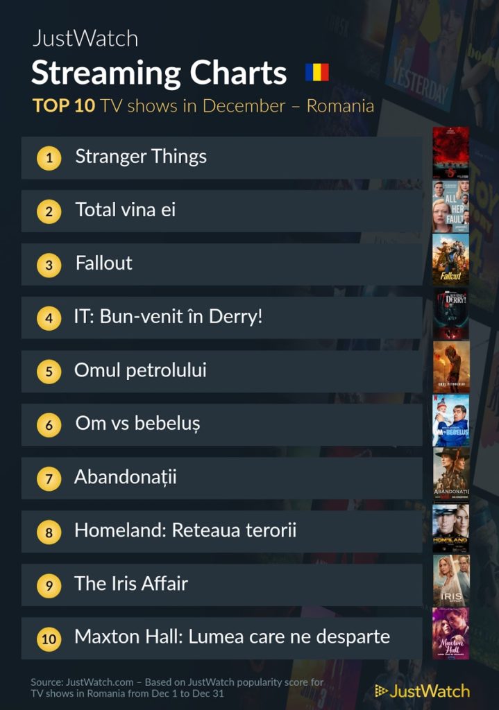 Conform JustWatch avem top 10 filme și seriale cele mai urmărite în luna decembrie 2025 pe serviciile de streaming video disponibile și în România, Disney+, Netflix, FilmBox+, MEGOGO, Prime Video, SkyShowtime România, max, Rakuten TV: