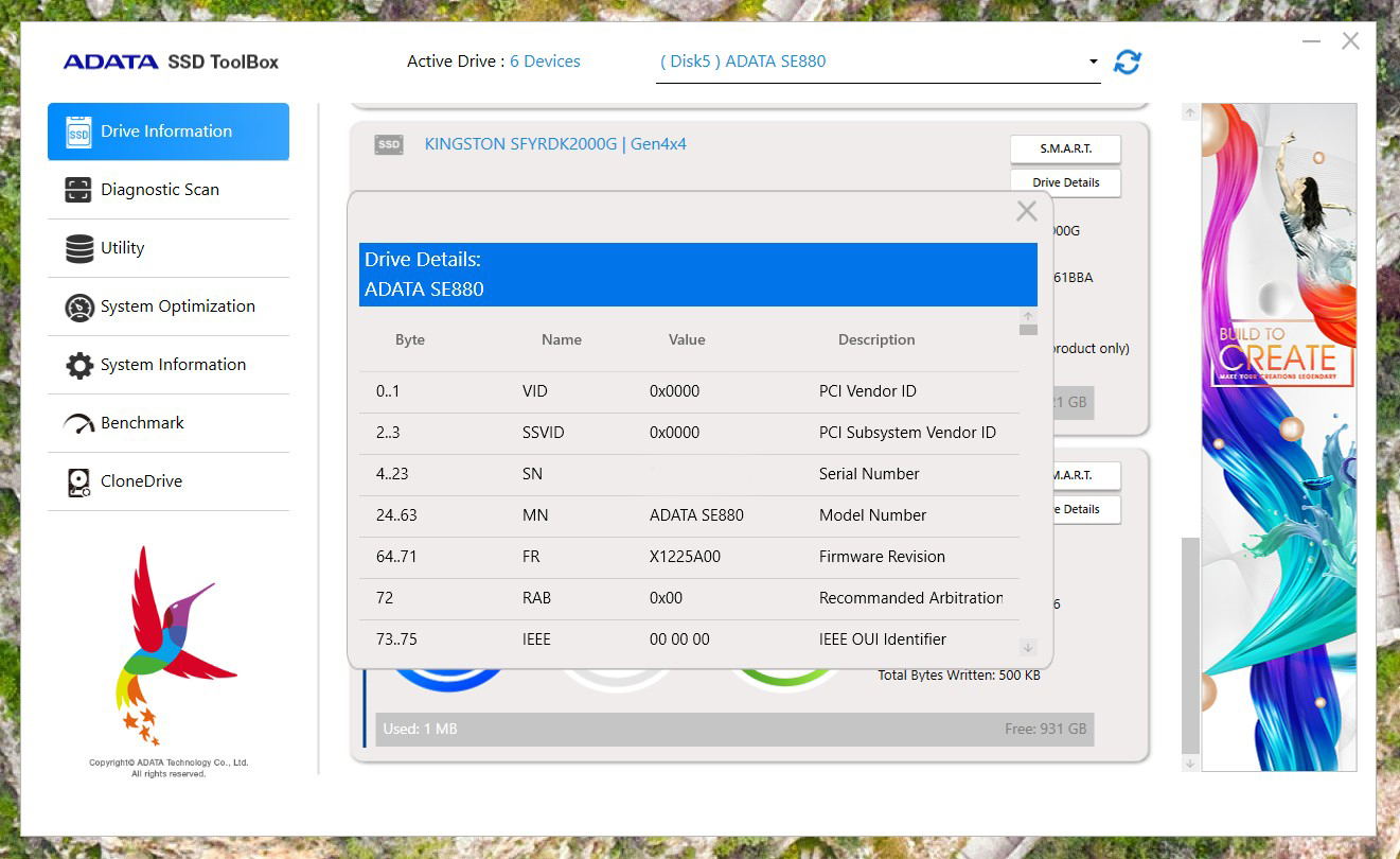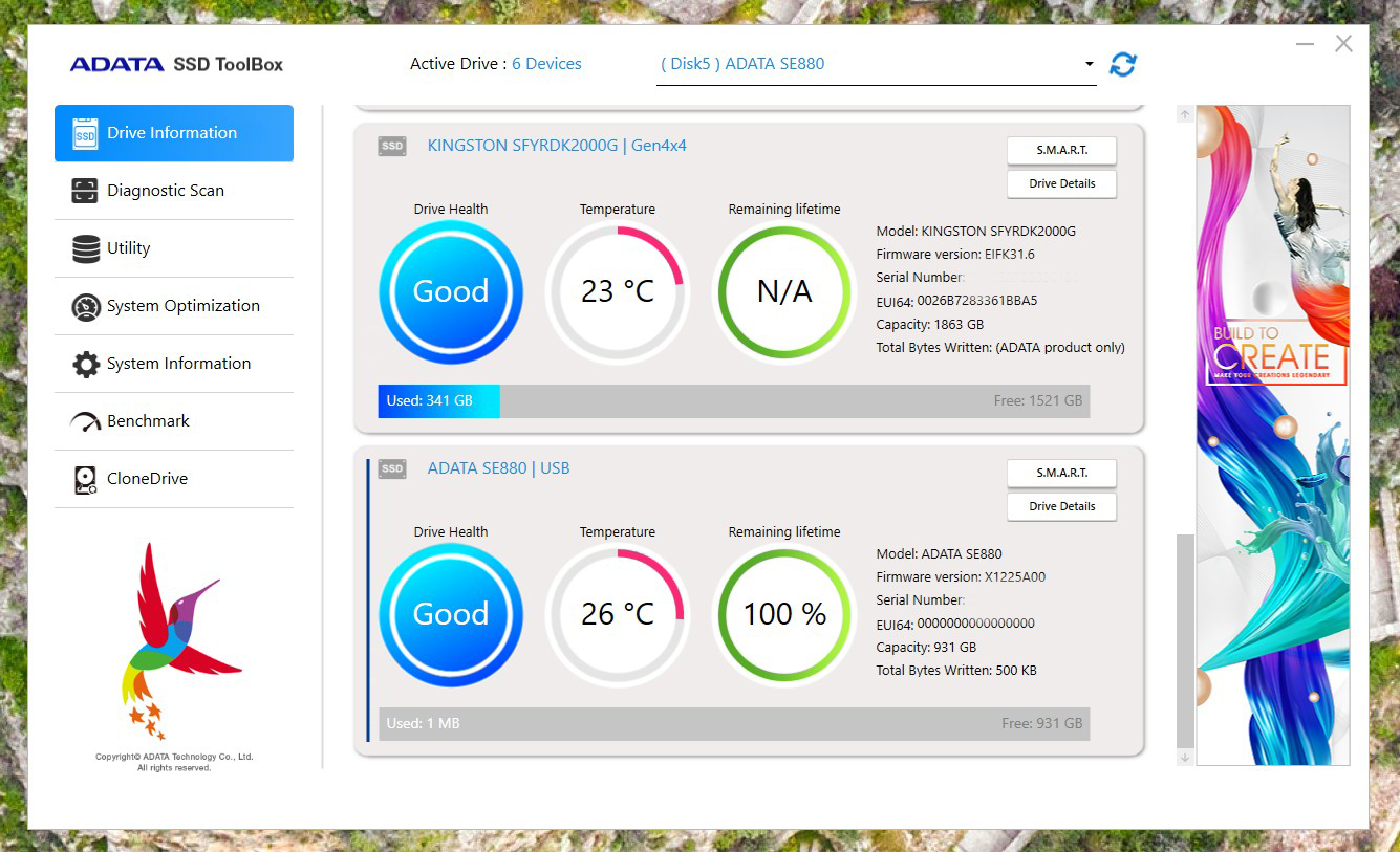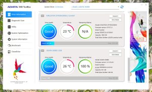 ADATA SE880 dispune și de o aplicație dedicată, ADATA SSD Toolbox (pentru PC/laptop), prin intermediul căreia poți afla informații despre dispozitiv, poți securiza datele, îl poți formata, actualiza firmware‑ul, testa, optimiza sau clona.