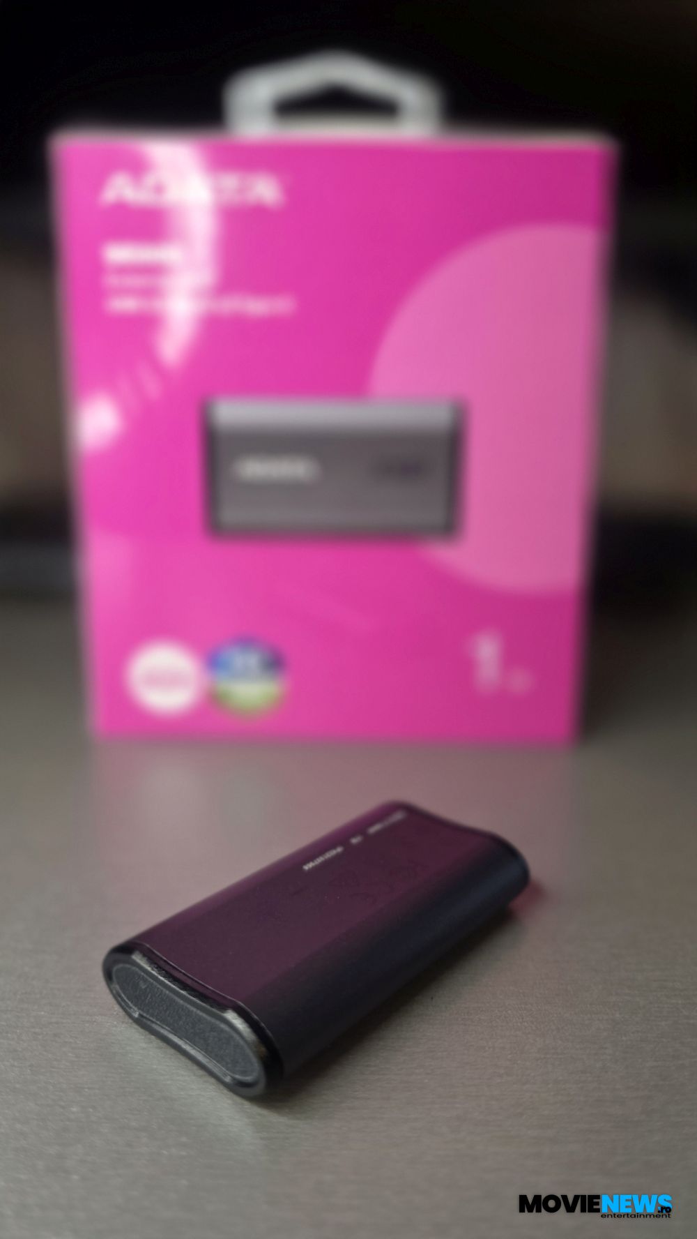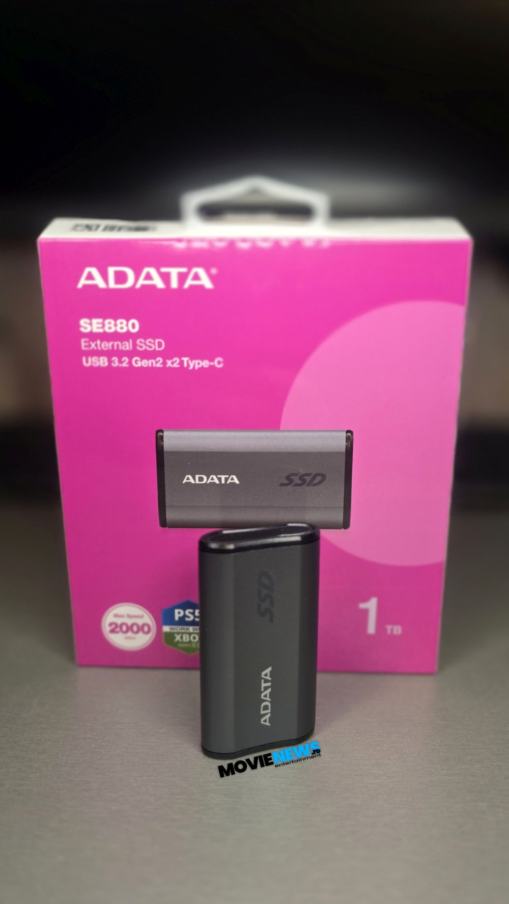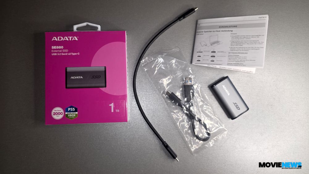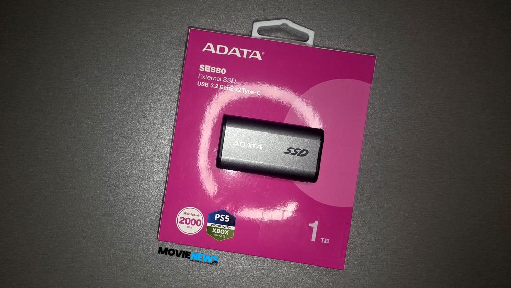 ADATA SE880 vine într-un ambalaj tipic pentru produsele ADATA, unde culoarea mov/magenta, în combinație cu alb, predomină. Cutia are o suprafață lucioasă pe care sunt imprimate toate informațiile necesare pentru a orienta potențialul cumpărător. Sigla ADATA, denumirea modelului SE880 și formatul dispozitivului (external SSD) sunt evidențiate clar. De asemenea, sunt imprimate imagini ale produsului, tipul de conectare (USB 3.2 Gen2 x2 Type‑C) – esențial pentru atingerea vitezelor de transfer de până la 2000 MB/s –, capacitatea modelului testat (1 TB) și compatibilitatea cu consolele PlayStation 5 și Xbox Series XS.
