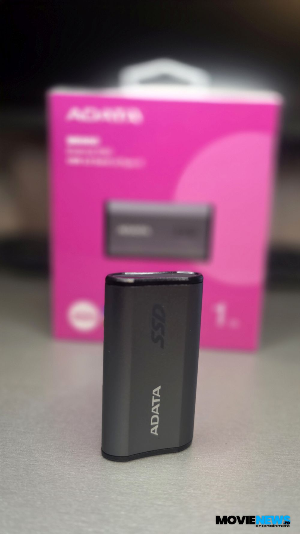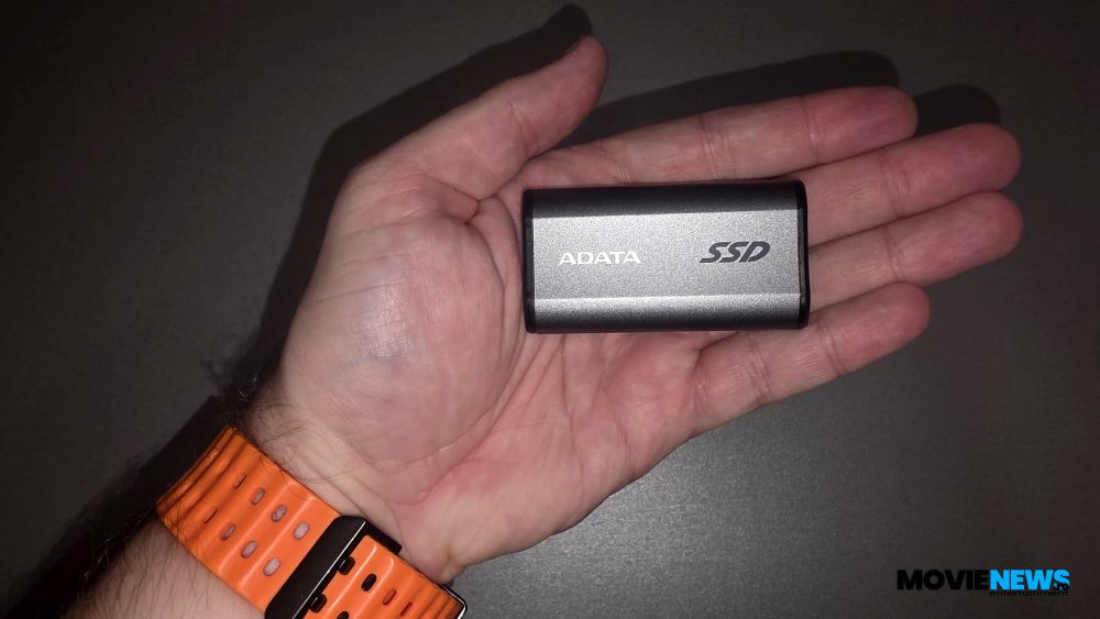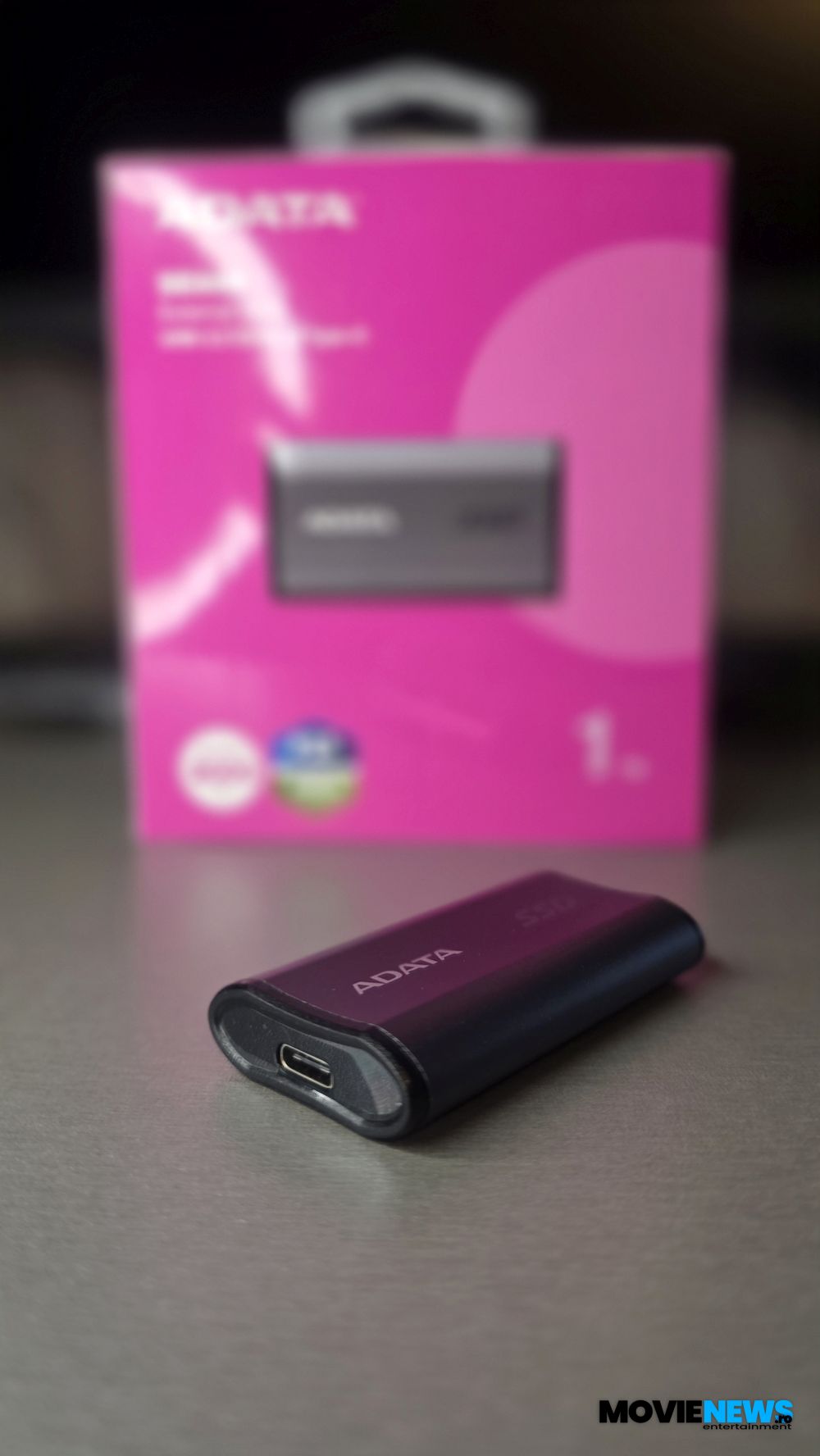 Ca aspect, culoarea gri predomină, forma fiind una dreptunghiulară, cu margini rotunjite și o suprafață sculptată într-un model plăcut atât vizual, cât și la atingere. La capete are capace negre, iar într-unul dintre ele se află un mic LED albastru de stare, alături de portul USB Type‑C. Pe o parte este imprimat logo‑ul ADATA, iar pe cealaltă sunt trecute câteva certificări, numărul de serie și alte informații.