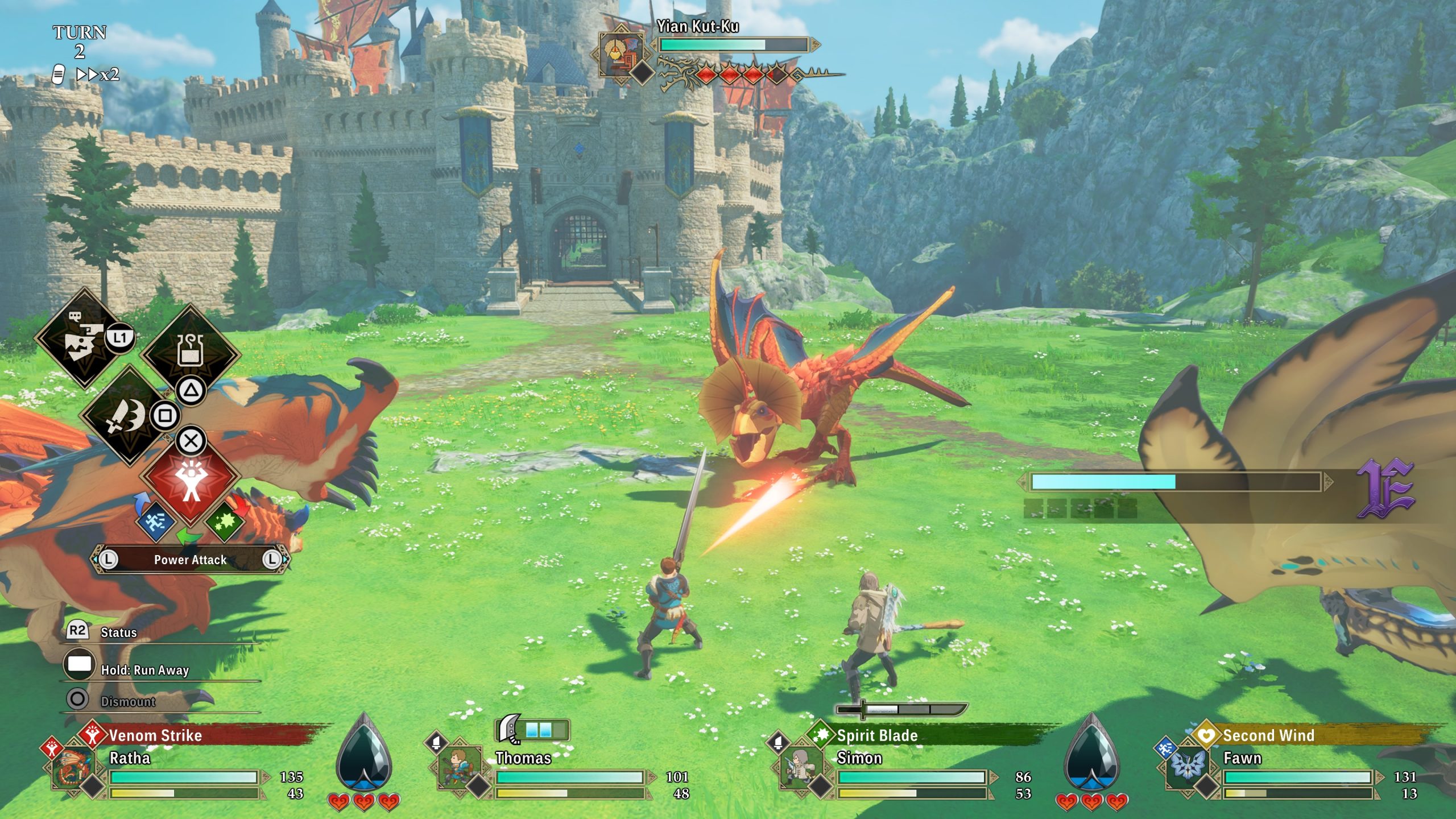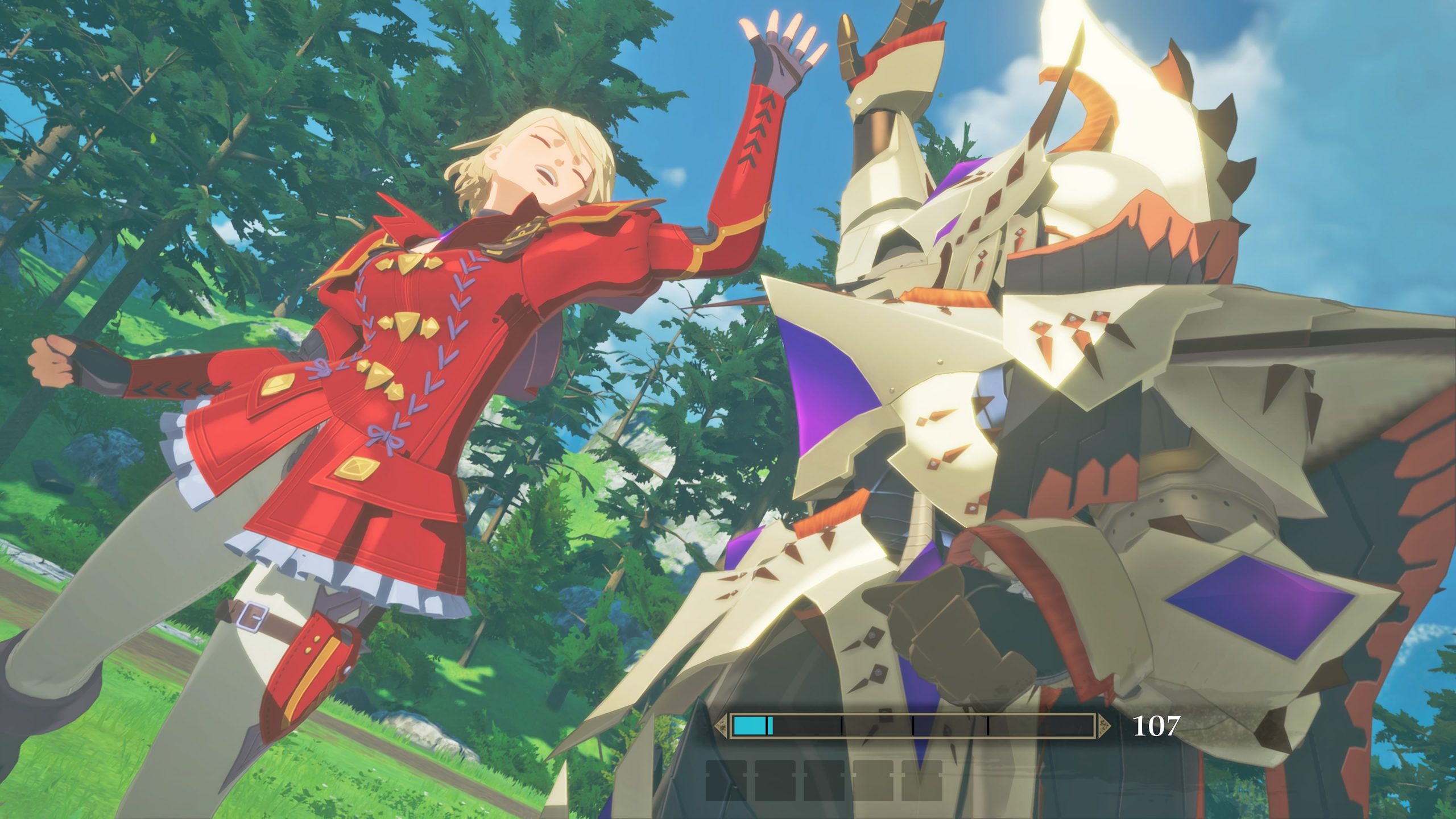 Așa cum spuneam și în introducere, jocul este un JRPG, cu o structură cunoscută fanilor genului. Luptele au loc pe ture și incorporează un sistem „complex” de „piatră-foarfecă-hârtie”, în care fiecare atac are o variație. Acestea pot fi puternice, rapide sau tehnice, iar memorarea tabelului vulnerabilităților (viteza bate puterea, puterea bate tehnicul iar acesta din urmă bate viteza) este necesară pentru a face față bătăliilor. Luptele necesită ceva strategie și adaptare, deoarece fiecare inamic are o altă vulnerabilitate. Când mai aruncăm și buff-uri, debuff-uri și atacuri speciale a la „All-Out” din Persona 5 sau Persona 3 Reload, avem rețeta clasică a unui JRPG. Desigur, bătăliile aici au acel fler Monster Hunter, deoarece fiecare atac poate țintă o locație anume de pe un monstru, precum coada, capul, aripile sau ghearele. Acest aspect permite dezvoltarea unor strategii complexe, în care fiecare membru al echipei atacă o altă zonă a inamicului.