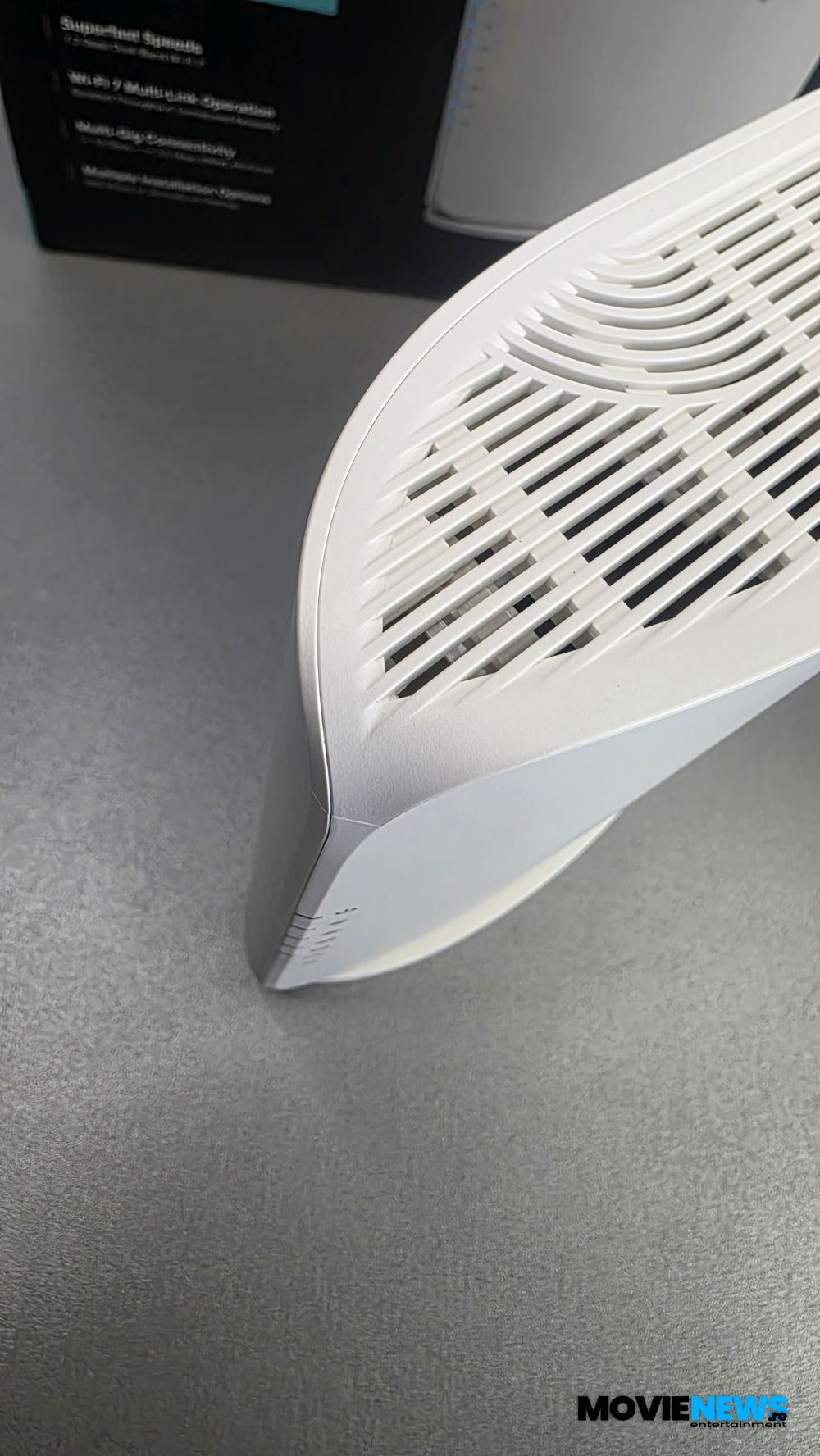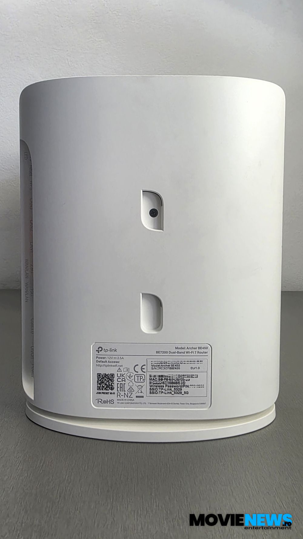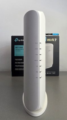 Archer BE450 este, după cum am stabilit, un router de tip turn, cu o carcasă din plastic și margini rotunjite, iar la o privire mai atentă ies în evidență câteva elemente elegante de design. Firește, apare întrebarea „unde sunt antenele?”, iar aici acest model impresionează din nou: antenele sunt integrate în interior, fără a afecta acoperirea — ba chiar oferind o rază mai mare decât routerele din generațiile anterioare.