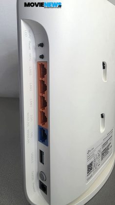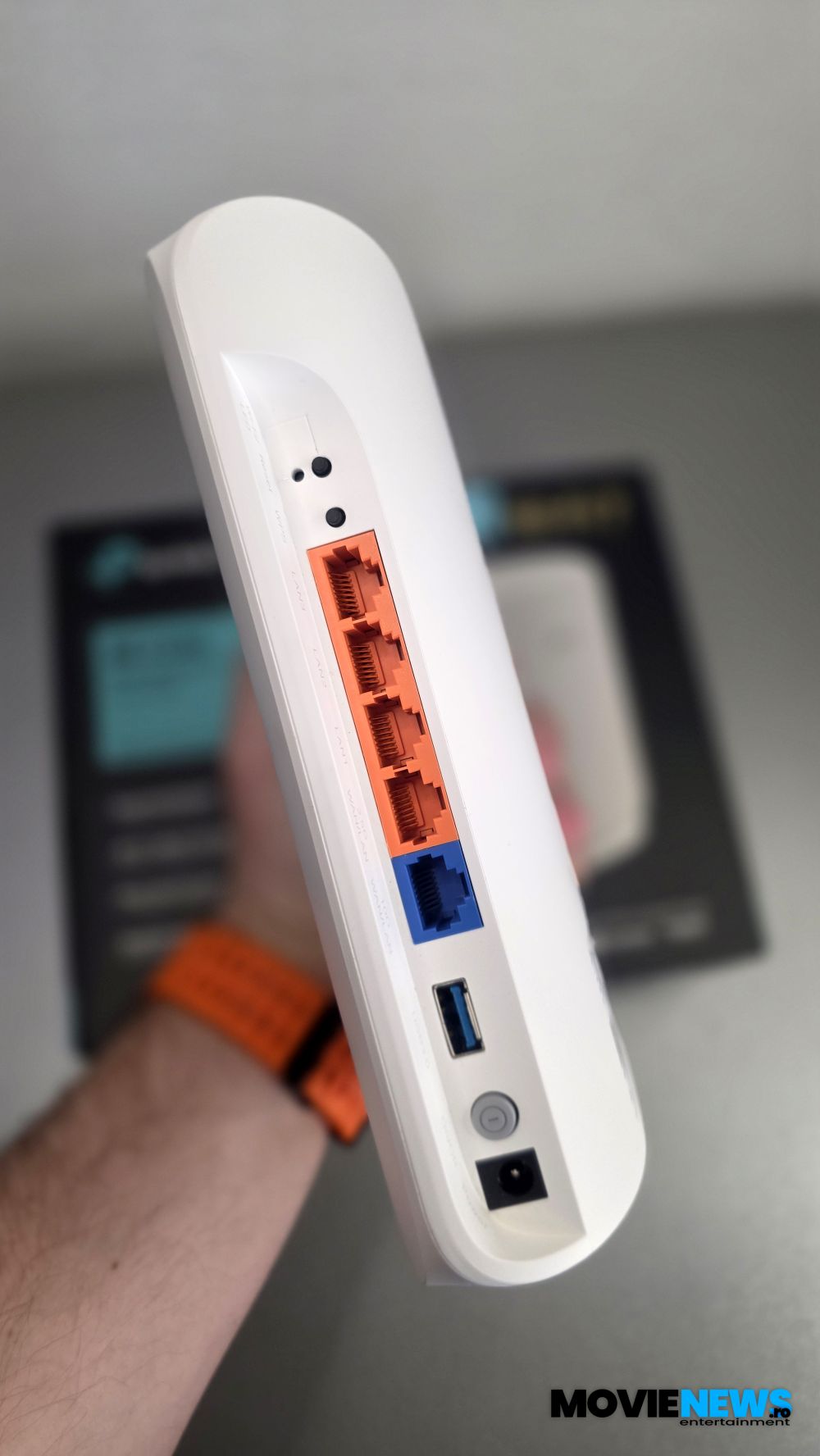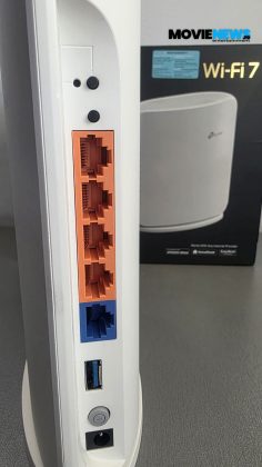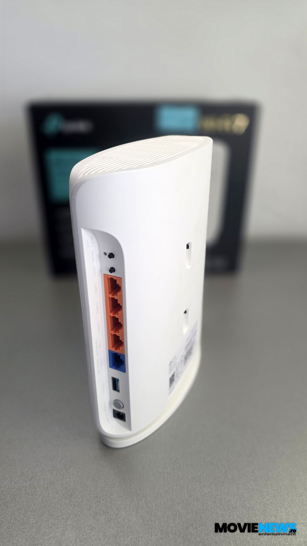 Aici găsim două butoane mici pentru Reset și WPS, un buton mai mare pentru Power, portul de alimentare, un port USB 3.0 multifuncțional și cinci porturi de rețea: patru galbene și unul albastru. Portul albastru și portul galben aflat lângă el pot funcționa atât ca WAN, cât și ca LAN. Portul albastru este de 10 Gbps, cel galben de lângă el este de 2.5 Gbps, iar celelalte trei porturi LAN sunt Gigabit. Lângă fiecare port și buton avem imprimate câte o mică pictogramă cu funcția sau vitezele menționate.