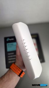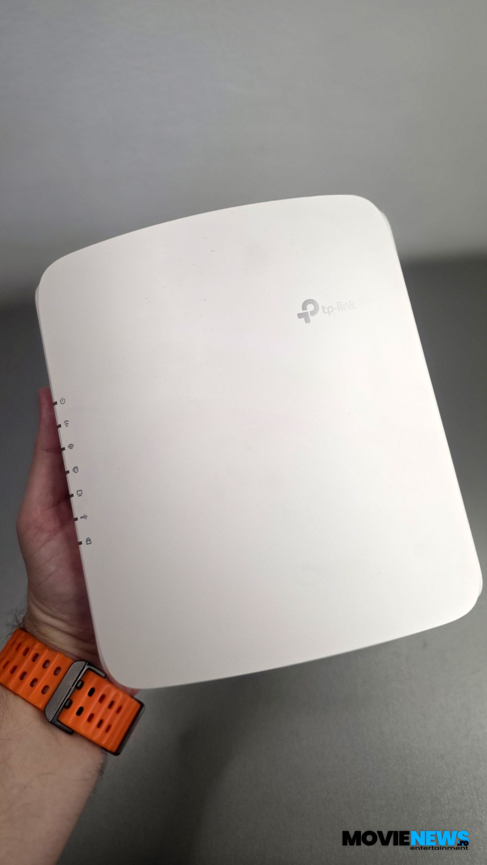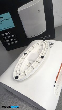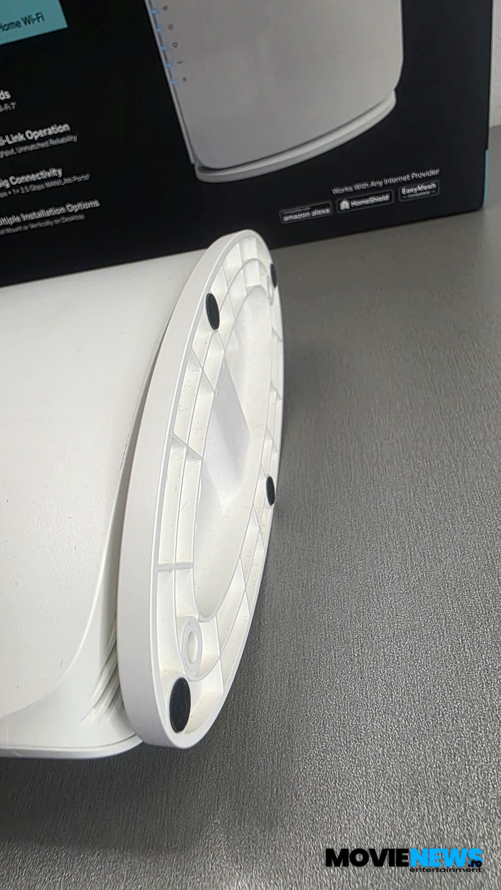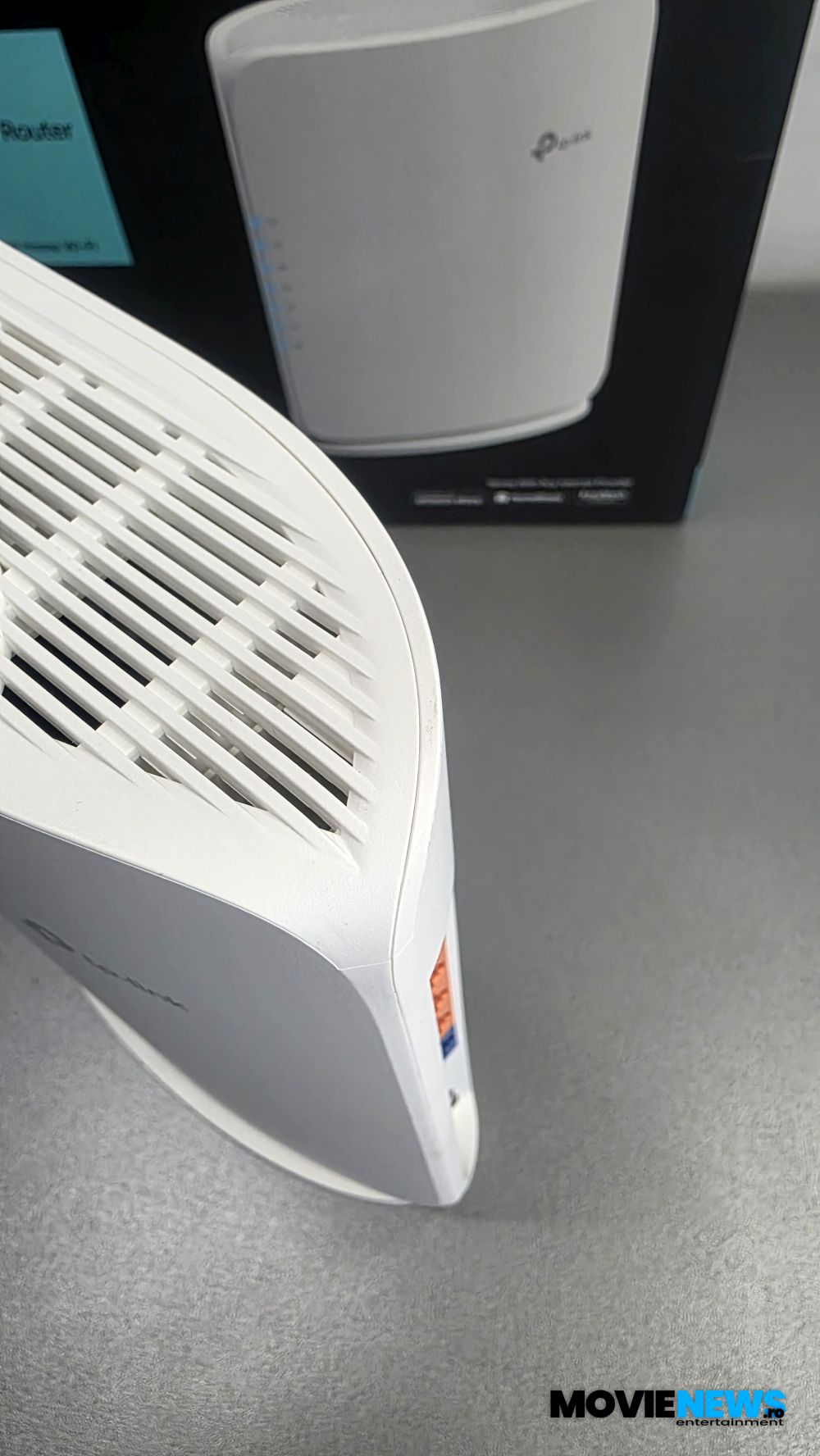 Pe una dintre laturi se află logo‑ul TP‑Link, iar pe cealaltă se observă două orificii poziționate central, pe care le regăsim și pe latura mică. În aceste orificii se fixează suportul/standul din plastic, fără a fi nevoie de unelte suplimentare. Suportul poate fi montat și pe perete, dacă se dorește. În funcție de latura pe care este atașat — cea mare sau cea mică — routerul poate fi poziționat pe verticală sau pe orizontală.