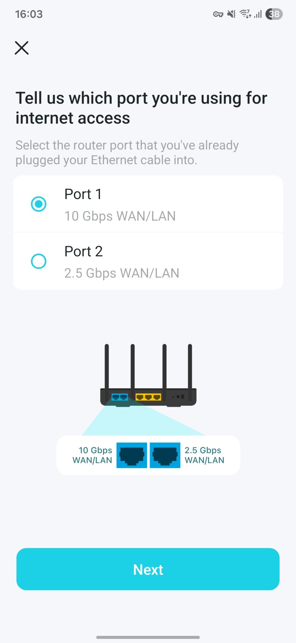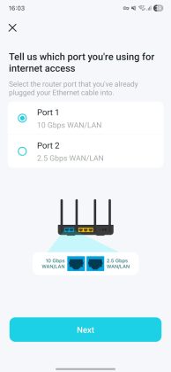 Dacă îl configurezi de pe PC/laptop, trebuie să accesezi pagina web a router‑ului. În aplicația Tether, pe care o descarci din Google Play sau App Store, trebuie să urmezi câțiva pași simpli pentru stabilirea conexiunii, denumirea rețelei și setarea parolei — iar configurarea este gata. În aplicația Tether vei vedea dispozitivele conectate, inclusiv Archer BE450, și va trebui să alegi portul WAN, adică cel prin care intră semnalul de internet: 10G (albastru) sau 2.5G (galben, lângă cel albastru).