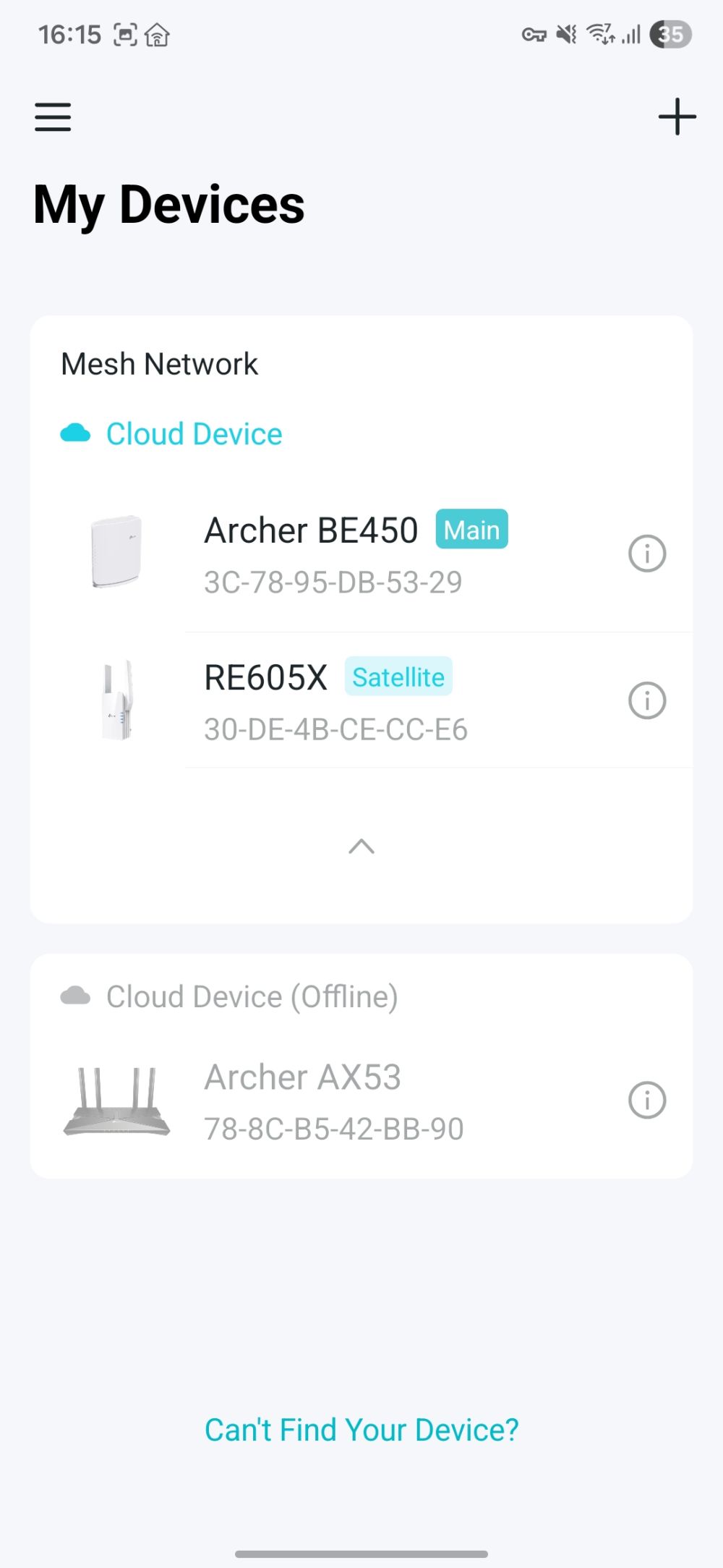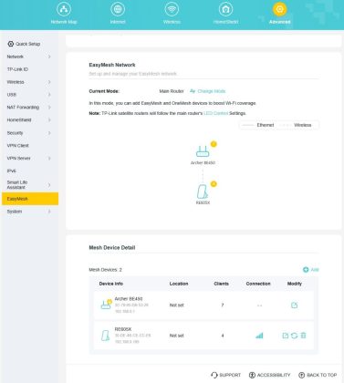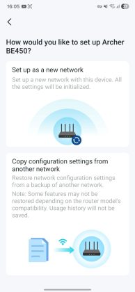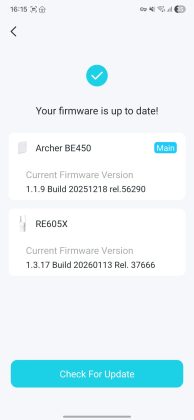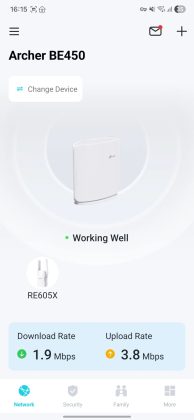 Router‑ul folosit anterior în locație a fost un TP‑Link Archer AX53, cuplat cu un Range Extender RE605X prin OneMesh, despre care am vorbit în recenzia noastră. Acum am folosit Archer BE450 și am conectat același extender RE605X la acesta. Să nu uităm însă că router-ul vechi și extenderul funcționau pe Wi‑Fi 6, iar acum avem Wi‑Fi 7 pe router și Wi‑Fi 6 pe extender. Extender-ul a fost detectat imediat în aplicația Tether și l‑am cuplat prin OneMesh fără probleme.