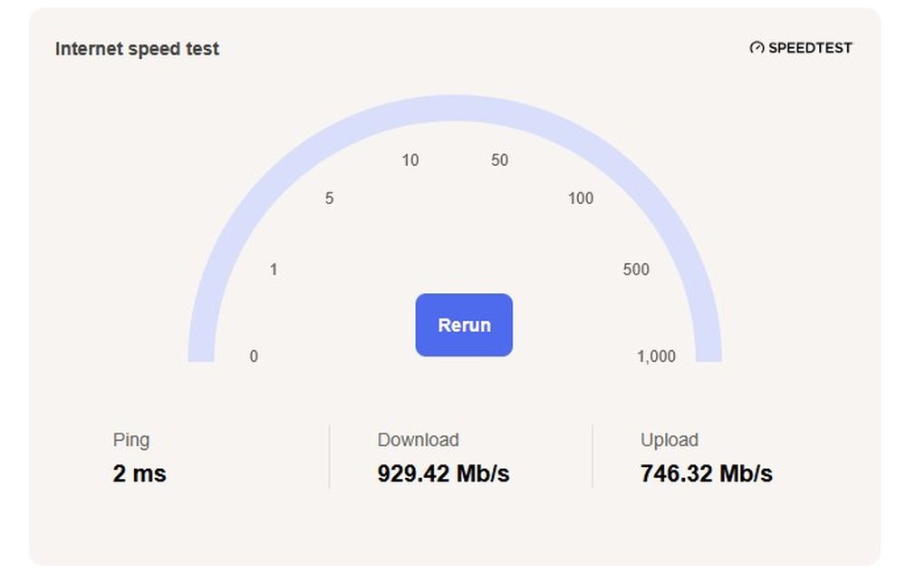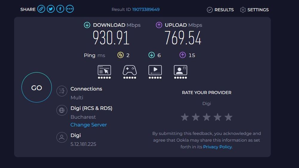Configurarea de testare am realizat‑o conectând internetul (DIGI – 1 Gbps, cu intenția de upgrade la 2.5 Gbps sau chiar 10 Gbps când va fi cazul) în portul albastru de 10 Gbps, PC‑ul în portul de 2.5 Gbps, iar TV‑ul și consola PS5 în porturile galbene de 1 Gbps. Am efectuat câteva teste de transfer pe PC și am obținut viteza maximă posibilă (aproximativ 1 Gbps). Pe TV și PS5 am testat serviciile de streaming (Netflix, HBO Max, Disney+, Prime Video), am descărcat jocuri pe consolă și am jucat online. Totul a funcționat impecabil: fără buffering enervant pe TV, fără probleme la descărcări și fără sesiuni de gaming cu ping ridicat.