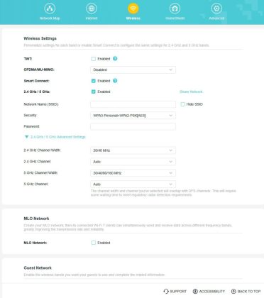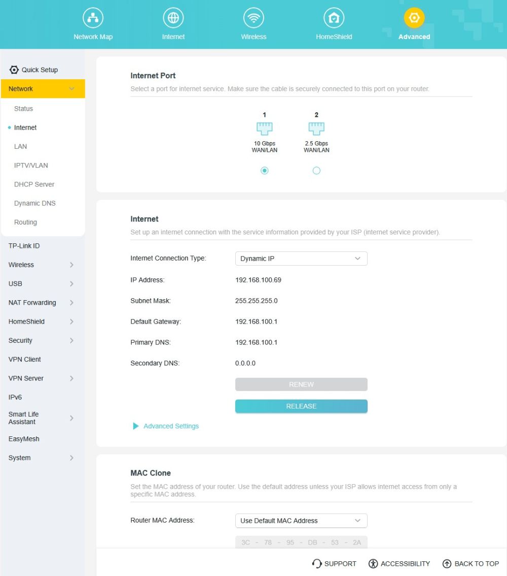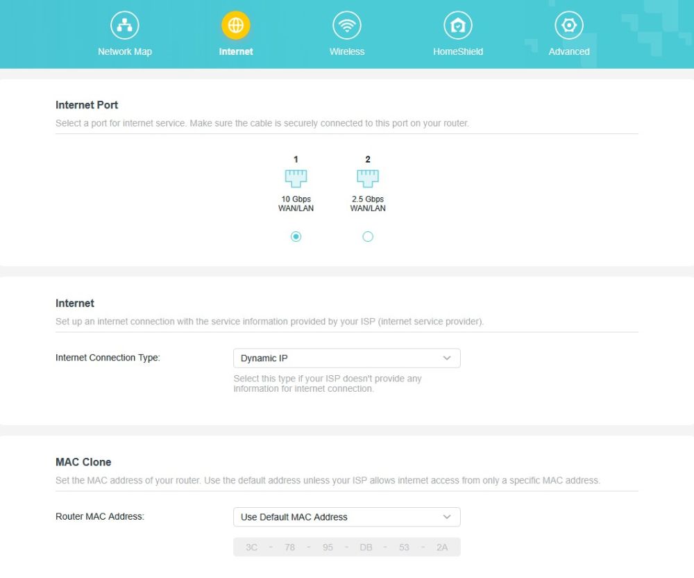 Pe partea de securitate, router‑ul oferă suport pentru HomeShield, iar la conexiunile pe fir utilizatorul poate alege portul care primește semnalul WAN: 10G sau 2.5G. Nu lipsește nici suportul pentru VPN client și VPN server.